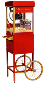 Machine à pop-corn munie d'un chariot sur lequel est déposé le compartiment vitré qui contient la chaudière (en acier inoxydable) ainsi qu'une plaque de fond chauffée.
